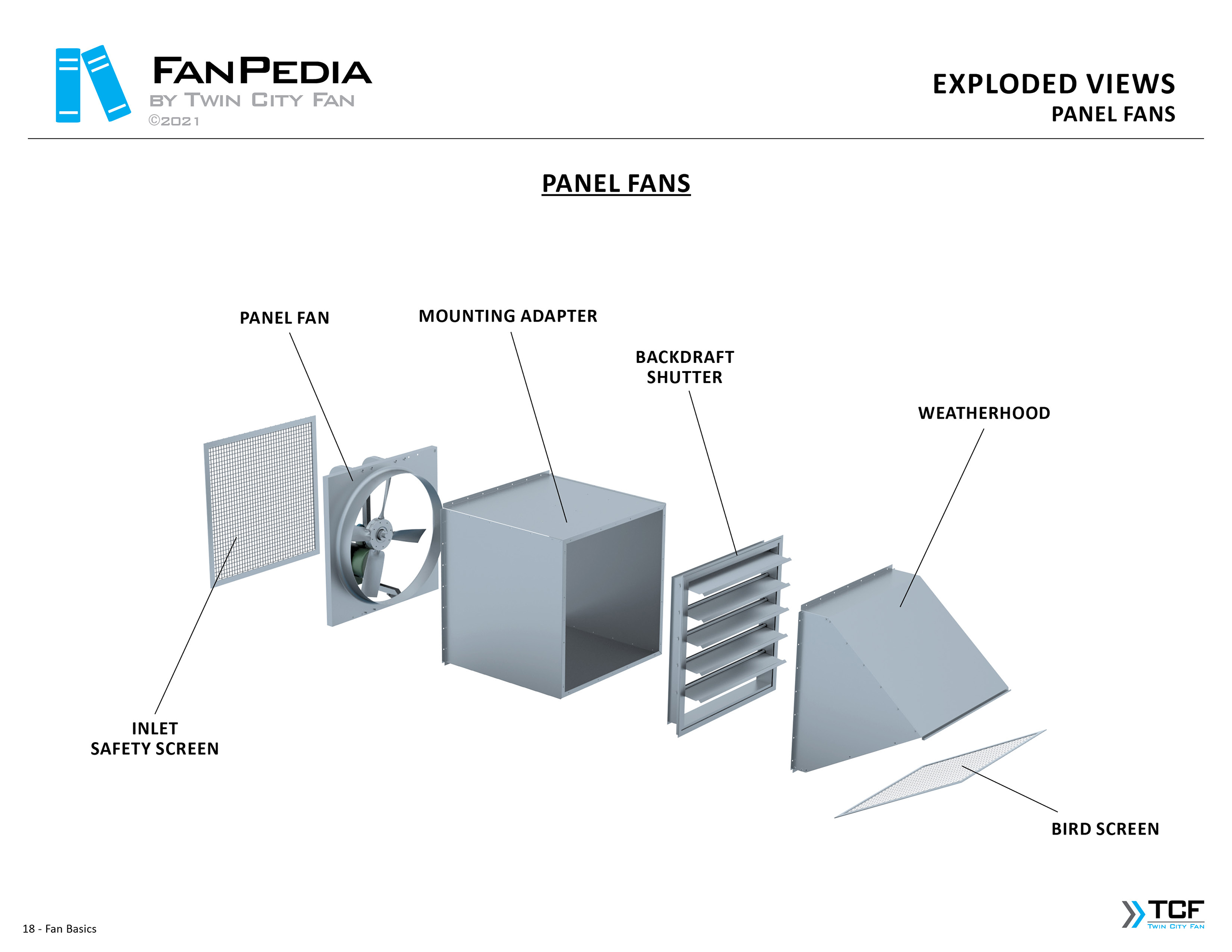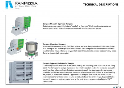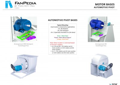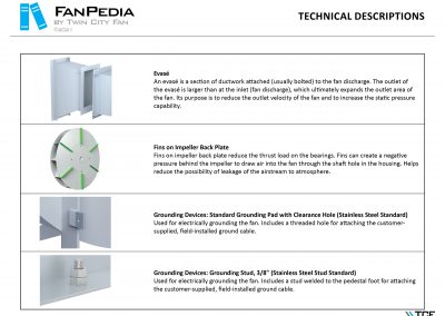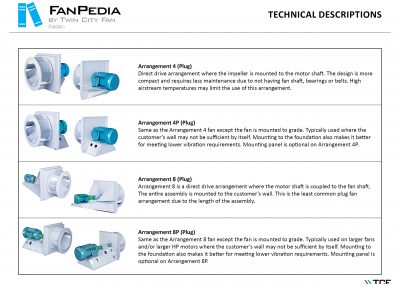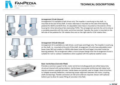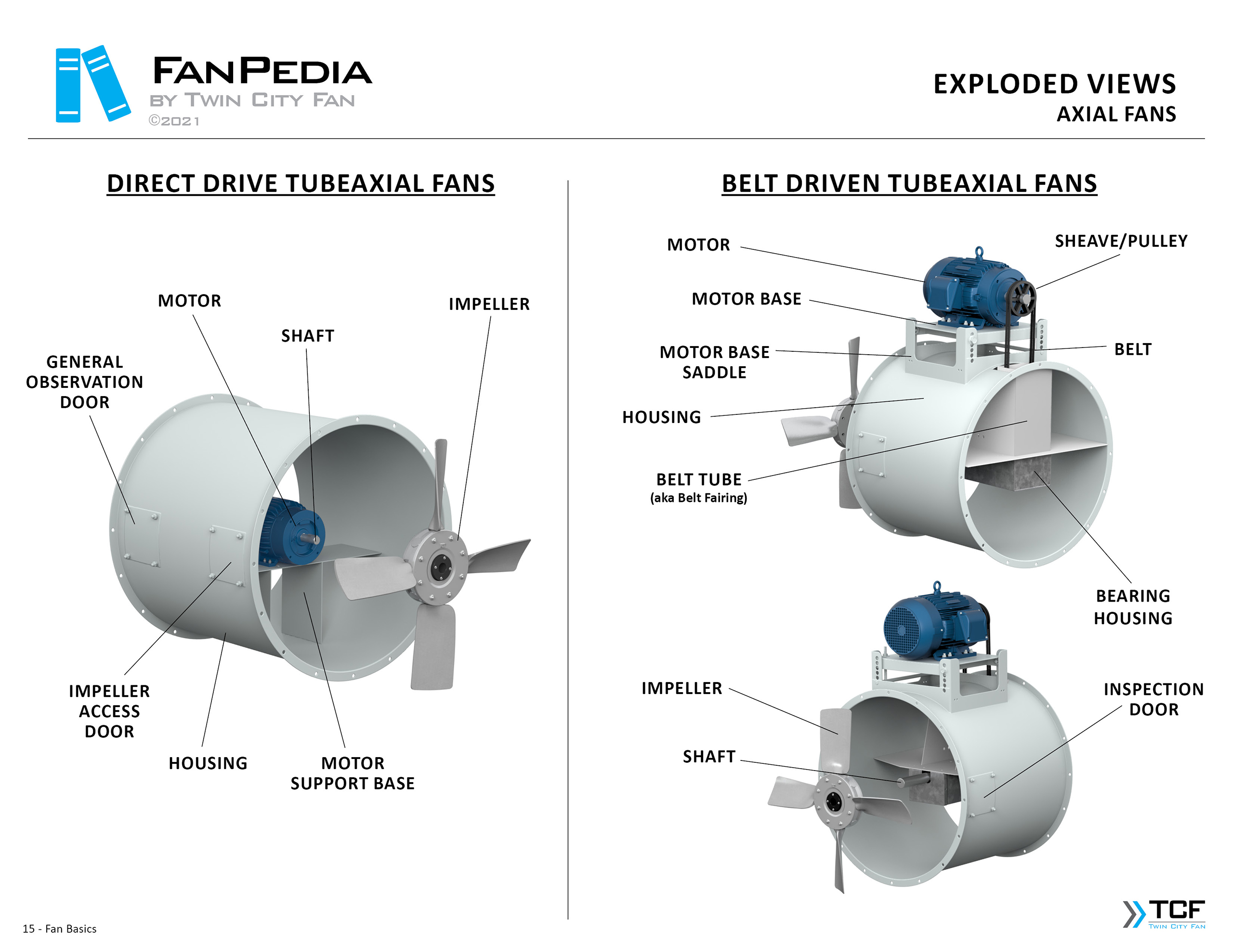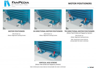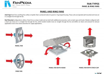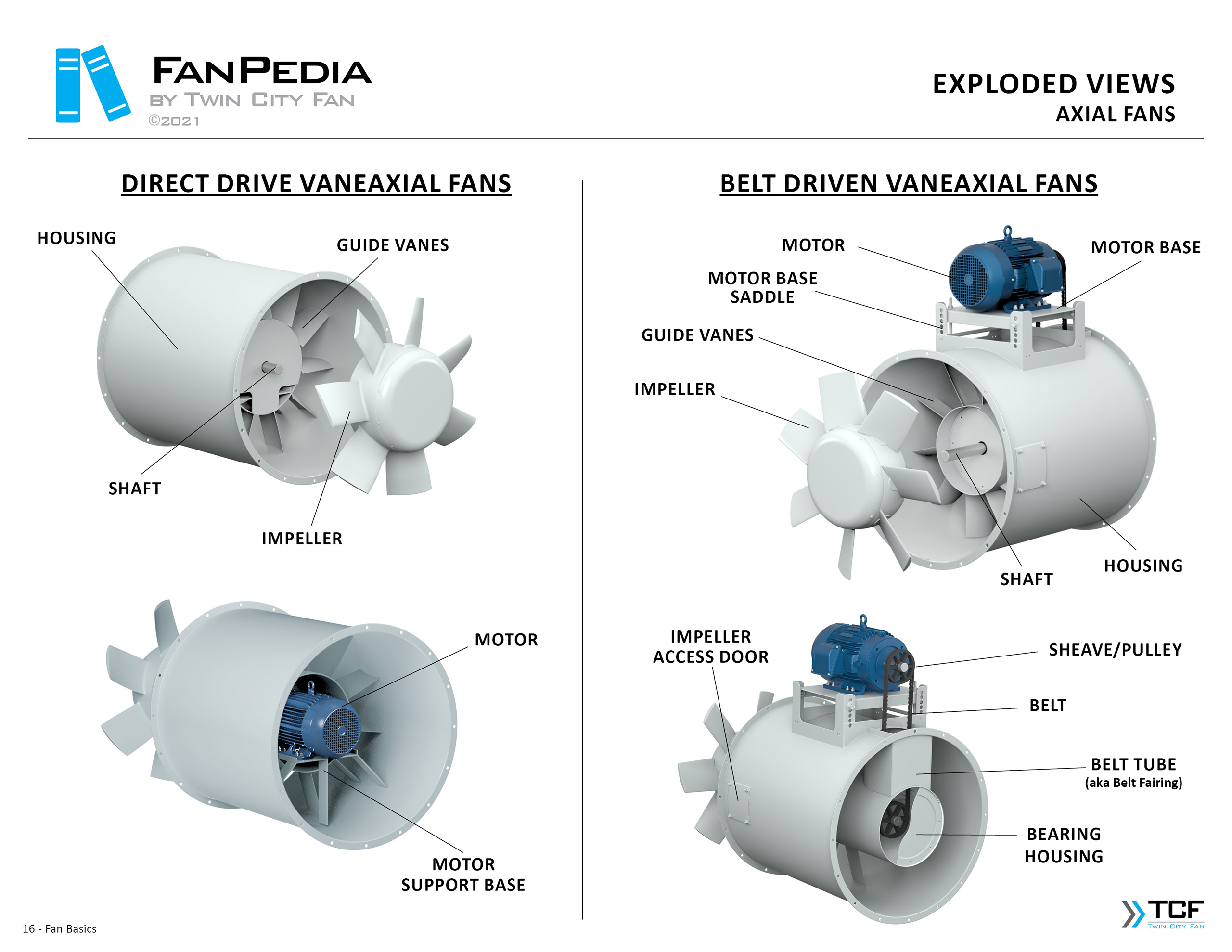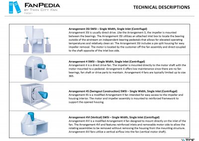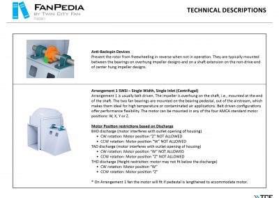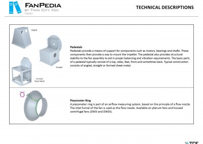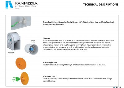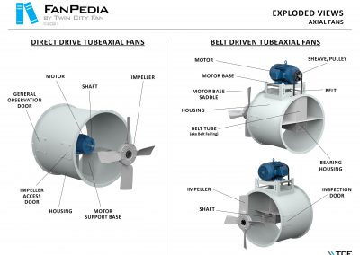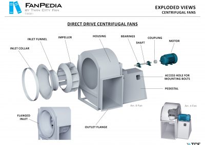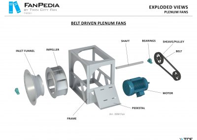 FanPedia The Fan & Blower Encyclopedia (click on thumbnails to view image galleries) Fan Basics Fan Types Exploded Views Fan Arrangements Impeller Types, Impeller Orientation & Hub Types Discharges & Impeller Rotation Impeller Airflow & Rotation (Axial Fans) Motor Positions Fan components Housing Construction Motors Motor Bases Shafts Pedestals Inlet Funnels / Venturis (Centrifugal) Bearing Types, Accessories & Modifications Fan Construction Spark Resistant Construction High Temperature Construction Insulated Fans Nominally Leak-Tight Construction RTO Construction High Moisture Construction Swingout & Clamshell Construction Fan Accessories Common Accessories Shafts Pedestals Base Types Vibration Isolation Dampers Inlet Vanes Grounding Devices Inlet Boxes Evasés Drain & Weep Holes Motor Positioners Shaft Seals Split Housings Piezometer Rings Technical Descriptions